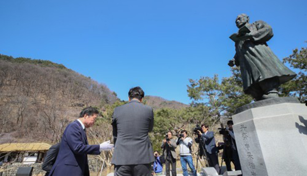 이낙연 국무총리가 지난달 8일 대전 중구 단재 신채호 선생 생가를 찾아 동상에 헌화하고 있다.