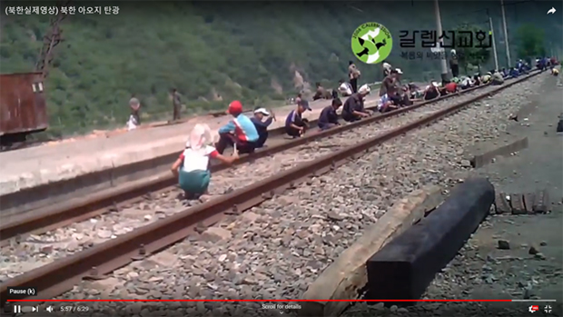 철길 보수에 동원돼 일하는 어린이들. 사진: 4월 5일 북한 아오지 탄광 제목의 갈렙선교회 동영상에서 캡쳐