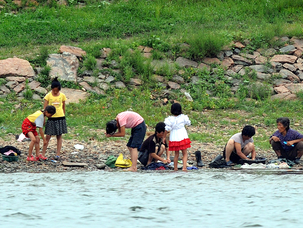 중국과 북한의 국경 압록강에서 바라본 신의주 강변 풍경. 빨래하는 주민들과 머리 감는 아이들.