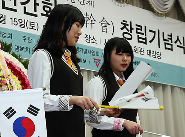 2014년 2월 15일 서울 YMCA회관 대강당에서 열린 '제87주년 신간회 창립기념식'에서 참가자들이 '우리의 소원은 통일'을 제창하고 있다. 신간회는 1927년 2월 안재홍, 이상재, 신채호 등 34명이 '민족 유일당 민족협동전선'이라는 표어 아래 민족주의를 표방하고 창립한 민족운동단체이다.
