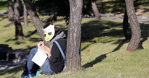 여성백일장'에 참가한 한 어머니가 나무에 기대어 앉아 글을 쓰고 있는 모습.